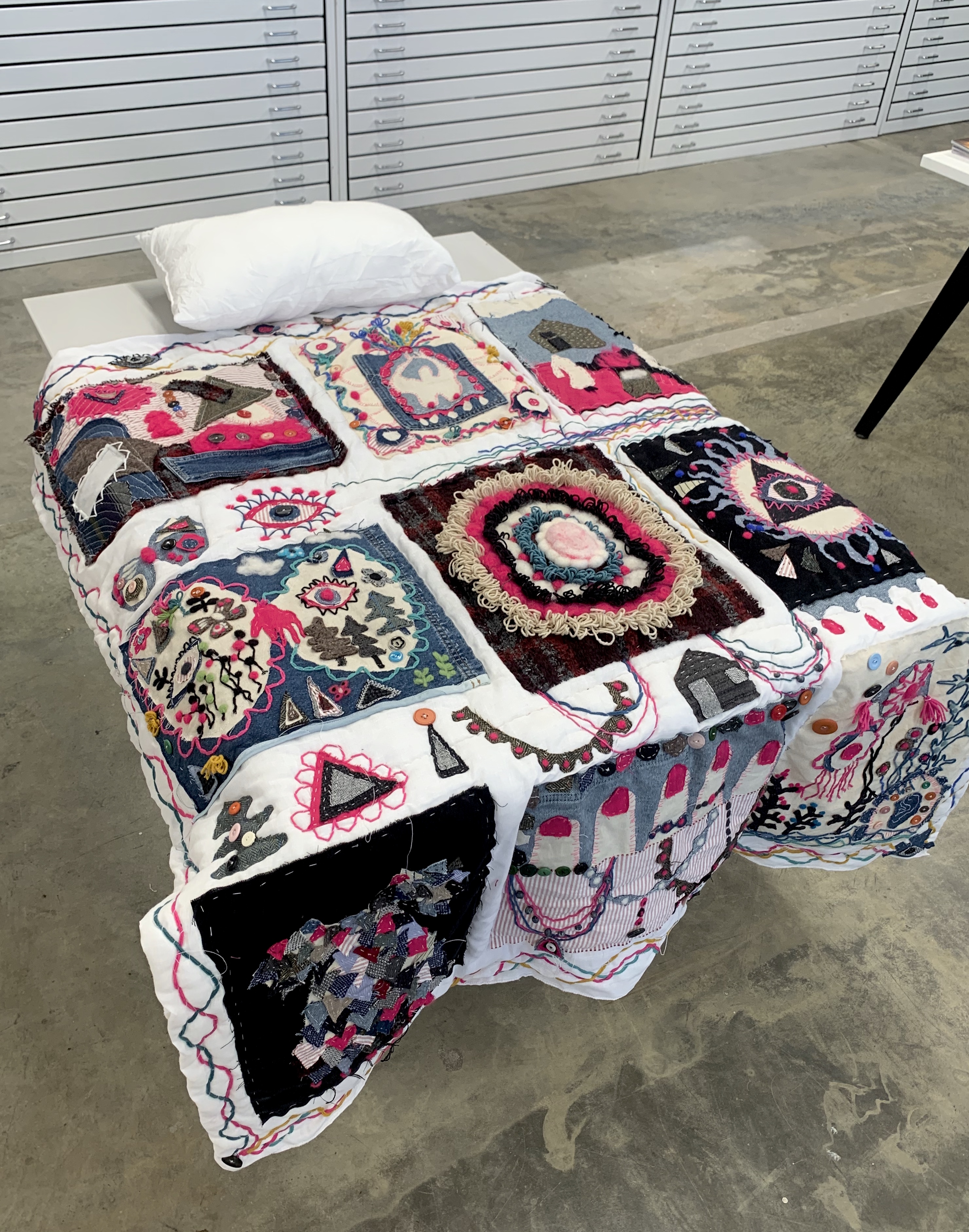 I made a quilt out of different fabrics, quilt is an object in close contact with the skin, and different quilts have different feel and smell. At the same time, it is everyone's most private object, can bring people beautiful dreams. For me, I often think a lot before going to bed, and I like the way the covers wrap me tight, like a hug, so I decided to use the quilt as a comfort object.